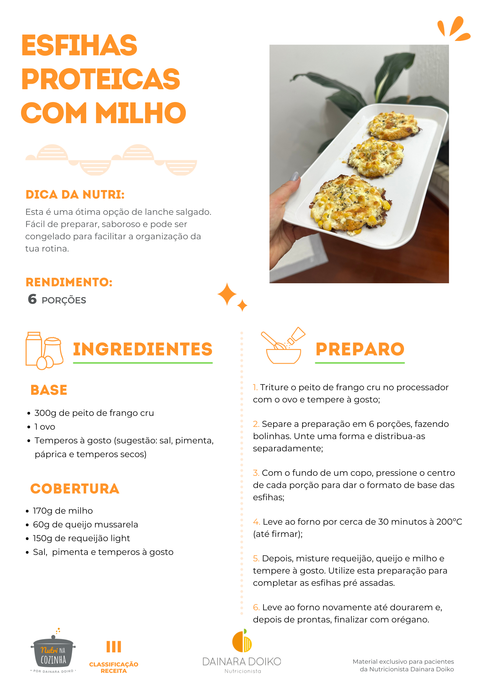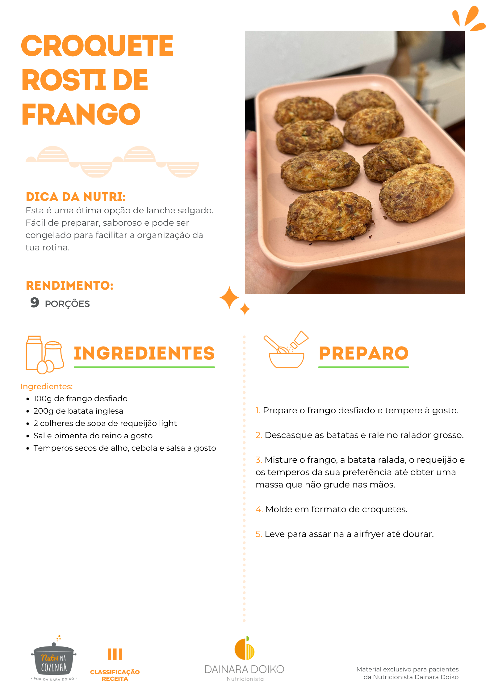 Ingredientes:500g de mandioquinha cozidas e amassadas1 ovo5 colheres de sopa de farinha de aveia400g de frango desfiadoSalsa e